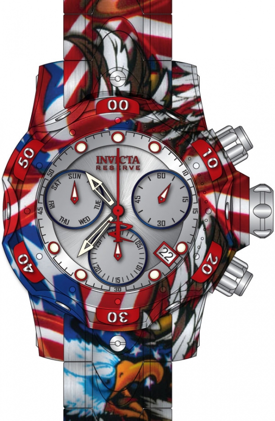 Silver-tone and red and aqua-plating stainless steel and aluminum case with a silver-tone and aqua plating stainless steel bracelet. Uni-directional rotating aqua-plating and red and silver stainless steel and aluminum bezel. Silver-tone dial with gunmetal hands and index hour markers. Minute markers around the outer rim. Dial Type: Analog. Luminescent hands and markers. Date display between 4 and 5 o'clock position. Three sub-dials displaying: day, 60 second and 30 minute. Ronda Caliber Z60 quartz movement. Scratch resistant Flame Fusion crystal. Screw down crown. Solid case back. Round case shape, case size: 44.4 mm, case thickness: 20.0 mm. Band width: 20 mm, band length: 7.25 inches. Fold over clasp. Water resistant at 1000 meters / 3300 feet. Functions: chronograph, date, day, hour, minute, small second. Reserve Series. Dive watch style. Watch label: Swiss Movt. Invicta Reserve Chronograph Quartz Silver Dial Ladies Watch 34653.