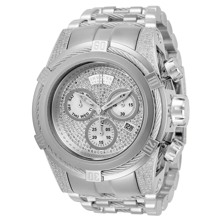 Silver-tone stainless steel case and bracelet. Uni-directional rotating silver-tone stainless steel bezel. Silver-tone dial with silver-tone hands and index hour markers. Dial Type: Analog. Luminescent hands and markers. Date display at the 4 o'clock position. Three sub-dials displaying: day, 60 second and 30 minute. Ronda Caliber Z60 quartz movement. Scratch resistant Flame Fusion crystal. Screw down crown. Solid case back. Round case shape, case size: 53 mm, case thickness: 21 mm. Band width: 35 mm, band length: 8.25 inches. Fold over clasp. Water resistant at 200 meters / 660 feet. Functions: chronograph, date, day, hour, minute, small second. Reserve Series.