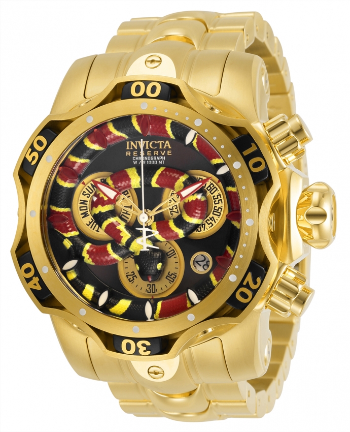 Two-tone (black and gold-tone) stainless steel and aluminum case with a gold-tone stainless steel bracelet. Uni-directional rotating two-tone (black and gold-tone) stainless steel and aluminum bezel. Black and grey and red and yellow and gold dial with red hands and index hour markers. Dial Type: Analog. Luminescent hands and markers. Date display between 4 and 5 o'clock position. Chronograph - sub-dials displaying: three - week, 60 second, 30 minute. Ronda Caliber Z60 quartz movement. Scratch resistant flame fusion crystal. Screw down crown. Solid case back. Round case shape, case size: 52.5 mm, case thickness: 22.6 mm. Band width: 26 mm, band length: 8.25 inches. Fold over clasp. Water resistant at 1000 meters / 3300 feet. Functions: chronograph, date, day, hour, minute, small second. Dive watch style. Watch label: Swiss Movt. Invicta Reserve Cobra Chronograph Quartz Mens Watch 30312.