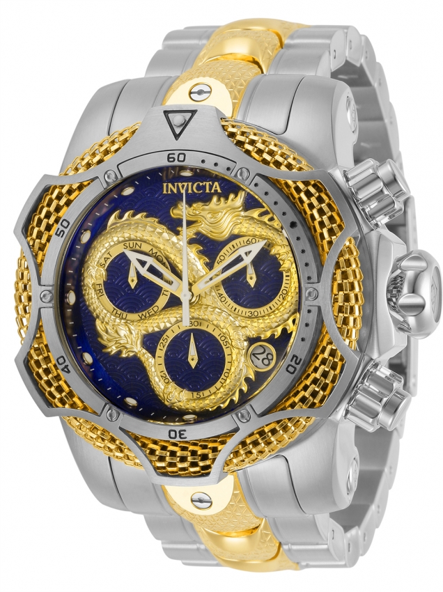 Two-tone (silver-tone and gold-tone) stainless steel case and bracelet. Uni-directional rotating two-tone (silver-tone and gold-tone) stainless steel bezel. Blue and gold dial with gold-tone hands and index hour markers. Minute markers around the outer rim. Dial Type: Analog. Luminescent hands and markers. Date display at the 4 o'clock position. Three sub-dials displaying: day, 60 second and 30 minute. Ronda Caliber Z60 FE quartz movement. Scratch resistant mineral crystal. Screw down crown. Solid case back. Round case shape, case size: 52.5 mm, case thickness: 22.6 mm. Band width: 26 mm, band length: 8.25 inches. Fold over clasp. Water resistant at 1000 meters / 3300 feet. Functions: chronograph, date, day, hour, minute, second. Reserve Series. Dive watch style. Watch label: Swiss Movt. Invicta Reserve Gen III Dragon Dive Chronograph Quartz Mens Watch 31516.