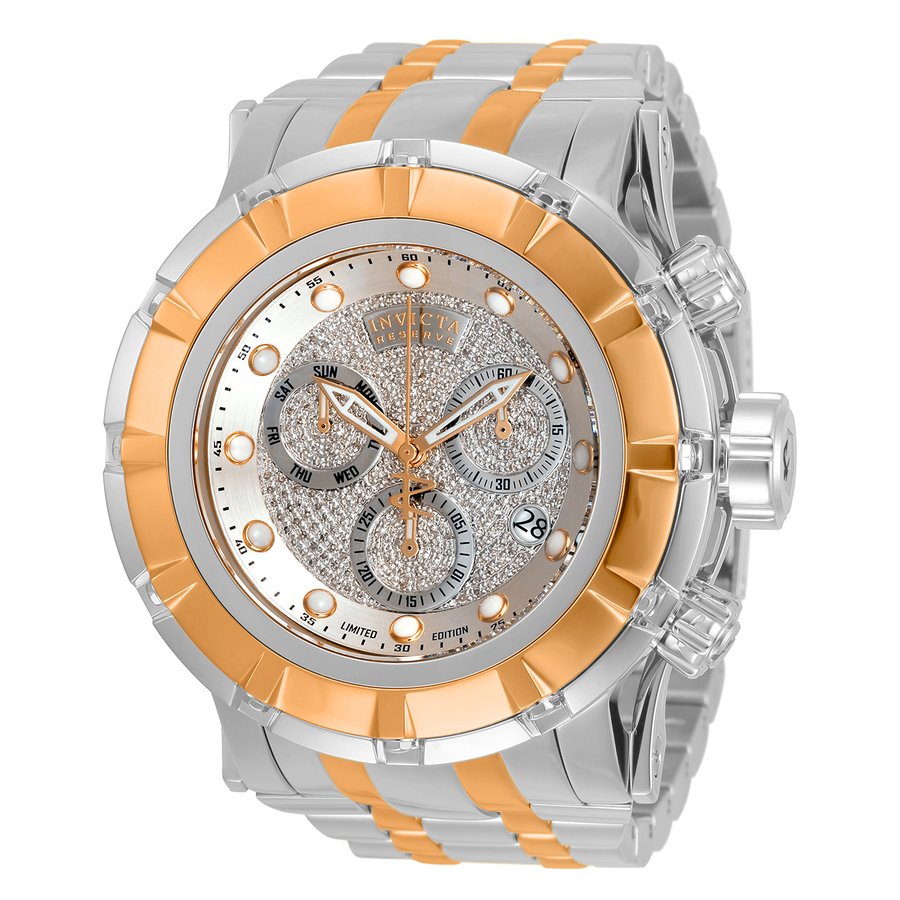The exceptional taste and distinguished palette of the connoisseur will discover timeless pleasure within the Invicta Reserve collection. Specially developed for those in the know Reserve is a reinvention of the superb to create the ultimate in horological finery. These timepieces represent a pinnacle in superiority for the discerning aficionado. Two-tone (silver-tone and rose gold-tone) stainless steel case with a silver-tone and rose gold stainless steel bracelet. Fixed silver-tone and rose gold stainless steel bezel. Silver-tone dial with rose gold-tone hands and index hour markers. Minute markers around the outer rim. Dial Type: Analog. Luminescent hands and markers. Date display at the 4 o'clock position. Three sub-dials displaying: day, 60 second and 30 minute. Ronda Caliber Z60 quartz movement. Scratch resistant Flame Fusion crystal. Screw down crown. Solid case back. Round case shape, case size: 54 mm, case thickness: 20.4 mm. Band width: 35 mm, band length: 8.25 inches. Fold over clasp. Water resistant at 500 meters / 1650 feet. Functions: chronograph, date, day, hour, minute, small second. Reserve Series. Dive watch style. Watch label: Swiss Movt. Invicta Reserve Chronograph Quartz Silver Dial Mens Watch 32769.