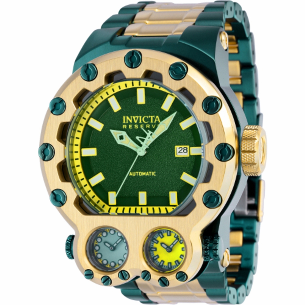 Gold-tone stainless steel case with a two-tone (green and gold-tone) stainless steel bracelet. Fixed green and gold stainless steel bezel. Green dial with green hands and index hour markers. Minute markers around the outer rim. Dial Type: Analog. Luminescent hands and markers. NH35A, 1042, 1042 quartz movement. Scratch resistant Flame Fusion crystal. Screw down crown. Transparent see through case back. Unique case shape, case size: 52 mm, case thickness: 18.5 mm. Band width: 34 mm, band length: 8.25 inches. Fold over clasp. Water resistant at 200 meters / 660 feet. Functions: date, hour, minute, second, 3 time zone. Reserve Series. Casual watch style. Invicta Reserve Magnum Tria Quartz Green Dial Mens Watch 37556.