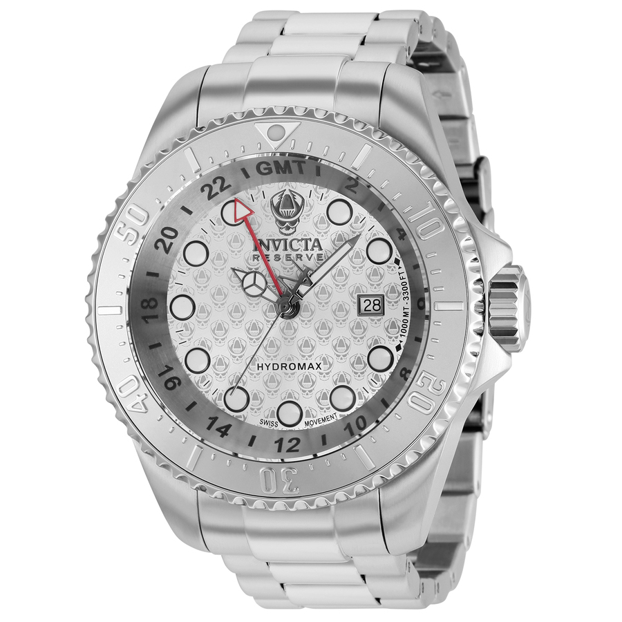 Stainless steel case with a stainless steel bracelet. Uni-directional rotating stainless steel bezel. Silver dial with luminous silver-tone hands and dot hour markers. 24 hour (GMT) markers around the outer rim. Dial Type: Analog. Luminescent hands and markers. Date display at the 3 o'clock position. Ronda caliber 515.24H quartz movement. Scratch resistant Flame Fusion crystal. Screw down crown. Solid case back. Round case shape. Case size: 52 mm. Case thickness: 23.6 mm. Band width: 24 mm, band length: 8.25 inches. Fold over clasp. Water resistant at 1000 meters / 3300 feet. Functions: date, GMT, second time zone, hour, minute, second. Reserve Series. Dive watch style. Watch label: Swiss Movt. Invicta Reserve Quartz Silver Dial Mens Watch 37216.