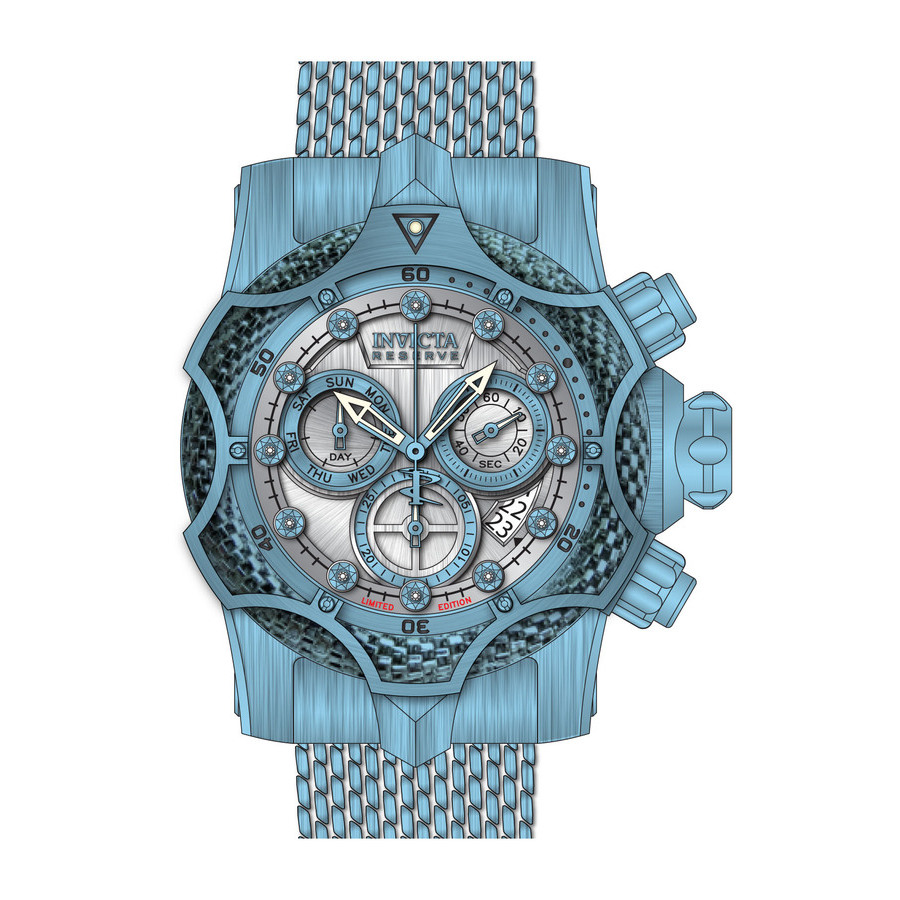 Light blue stainless steel case and bracelet. Uni-directional rotating light blue stainless steel bezel. Antique silver-tone dial with blue hands and index hour markers. Minute markers around the outer rim. Dial Type: Analog. Luminescent hands and markers. Date display at the 4 o'clock position. Three sub-dials displaying: day, 60 second and 30 minute. Ronda Caliber Z60 quartz movement. Scratch resistant Flame Fusion crystal. Screw down crown. Solid case back. Round case shape, case size: 52.5 mm, case thickness: 22.6 mm. Band width: 26 mm, band length: 8.25 inches. Fold over clasp. Water resistant at 1000 meters / 3300 feet. Functions: chronograph, date, day, hour, minute, small second. Reserve Series. Dive watch style. Watch label: Swiss Movt. Invicta Reserve Chronograph Quartz Silver Dial Mens Watch 35053.