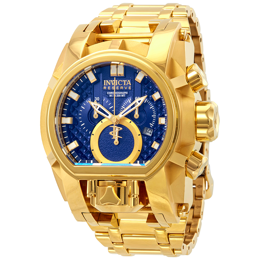 Yellow gold-plated stainless steel case and bracelet. Fixed yellow gold-plated bezel. Blue dial with yellow gold-tone skeleton hands and index hour markers. Minute markers around the outer rim. Dial Type: Analog. Luminescent hands and markers. Date display between the 4 and 5 o'clock positions. Chronograph - three sub-dials displaying: 60 second, 30 minute and 1/10th of a second. Ronda caliber 1042 quartz movement. Scratch resistant flame fusion crystal. Screw down crown. Solid case back. Unique case shape. Case size: 52 mm. Case thickness: 20 mm. Band width: 34 mm. Band length: 8 inches. Deployment clasp. Water resistant at 200 meters / 660 feet. Functions: chronograph, date, hour, minute, second. Sport watch style. Watch label: Swiss Movt. Invicta Reserve Chronograph Blue Dial Mens Watch 25209.