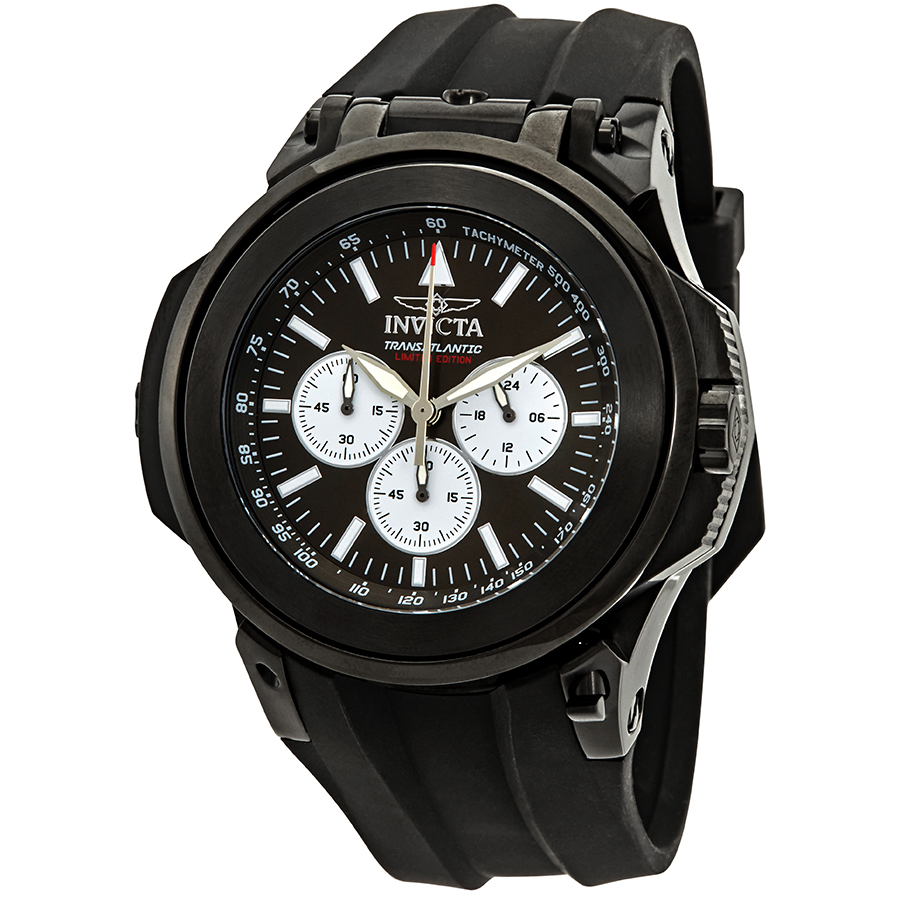 Black ion-plated stainless steel case with a black silicone strap. Uni-directional rotating black ion-plated stainless steel bezel. Black dial with silver-tone hands and Arabic numeral hour markers. Dial Type: Analog. Luminescent hands. SII Caliber VJ21 and SII Calibre VD54 quartz movement. Scratch resistant mineral crystal. Pull / push crown. Solid case back. Round case shape, case size: 50 mm, case thickness: 10 mm. Band width: 33 mm, band length: 10 inches. Tang clasp. Water resistant at 100 meters / 330 feet. Functions: hour, minute, second. Additional Info: two dials. Military watch style. Watch label: Japan Movt. Invicta Reserve Black Dial Military Mens Watch 25928.