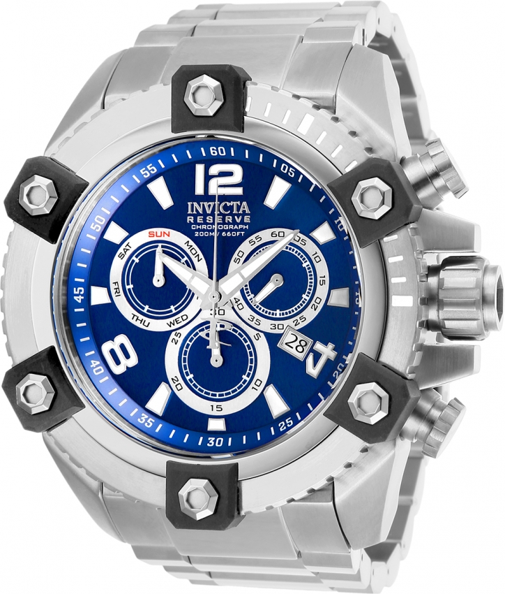 Silver-tone stainless steel case with a silver-tone stainless steel bracelet. Uni-directional rotating silver-tone stainless steel bezel. Blue dial with silver-tone hands and Arabic numeral and index hour markers. Minute markers around the outer rim. Dial Type: Analog. Luminescent hands and markers. Date display at the 4 o'clock position. Chronograph - three sub-dials displaying: week, 60 second, 30 minute. Ronda Caliber Z60 quartz movement. Scratch resistant flame fusion crystal. Pull / push crown. Solid case back. Round case shape, case size: 56 mm, case thickness: 19 mm. Band width: 31 mm, band length: 9.25 inches. Fold over clasp. Water resistant at 200 meters / 660 feet. Functions: chronograph, date, day, hour, minute, small second. Sport watch style. Watch label: Swiss Movt. Invicta Reserve Chronograph Quartz Blue Dial Mens Watch 26108.