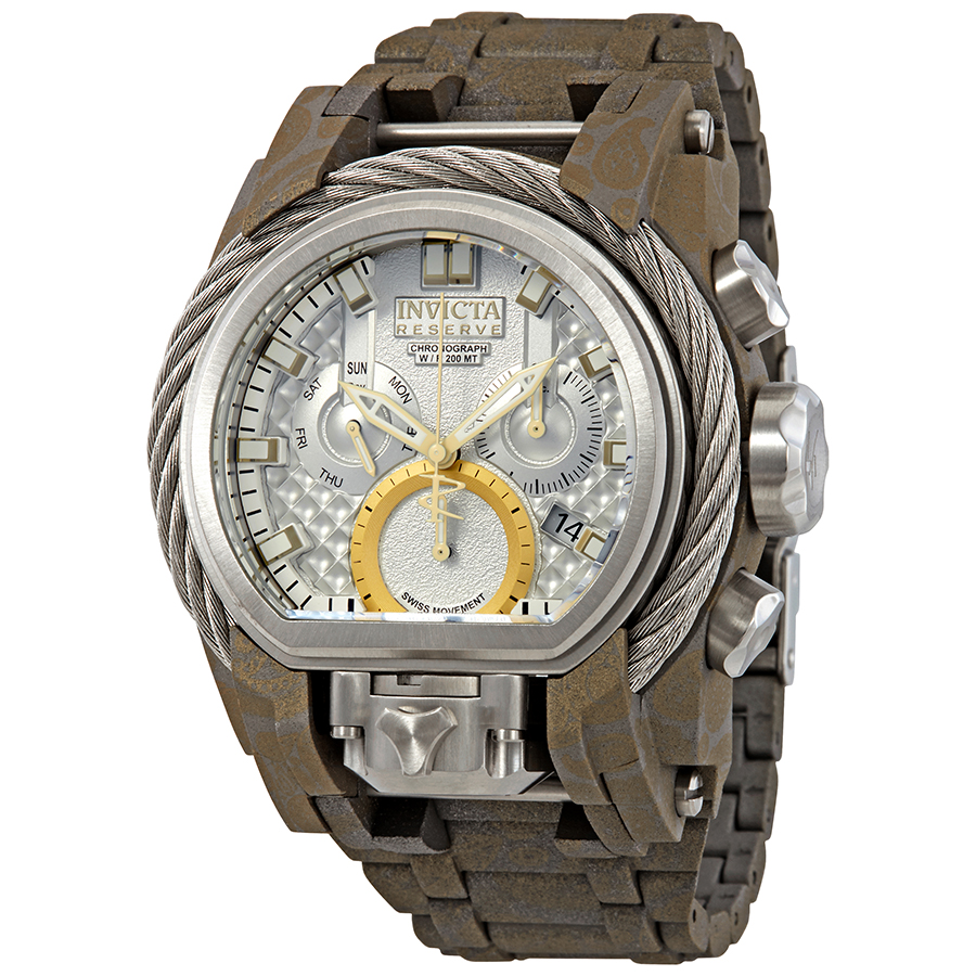 Silver-tone stainless steel case with a two-tone (silver-tone and aqua plating) stainless steel bracelet. Fixed two-tone (silver-tone and aqua plating) stainless steel bezel. Silver-tone dial with gold-tone hands and index hour markers. Minute markers around the outer rim. Dial Type: Analog. Luminescent hands and markers. Date display at the 4 o'clock position. Chronograph - three sub-dials displaying: 60 second, 30 minute and 1/10th of a second. Ronda Caliber 1042 quartz movement. Scratch resistant flame fusion crystal. Pull / push crown. Solid case back. Unique case shape, case size: 52 mm, case thickness: 20 mm. Band width: 34 mm. Fold over clasp. Water resistant at 200 meters / 660 feet. Functions: chronograph, date, hour, minute, second. Sport watch style. Watch label: Swiss Movt. Invicta Reserve Chronograph Silver Dial Mens Watch 26438.