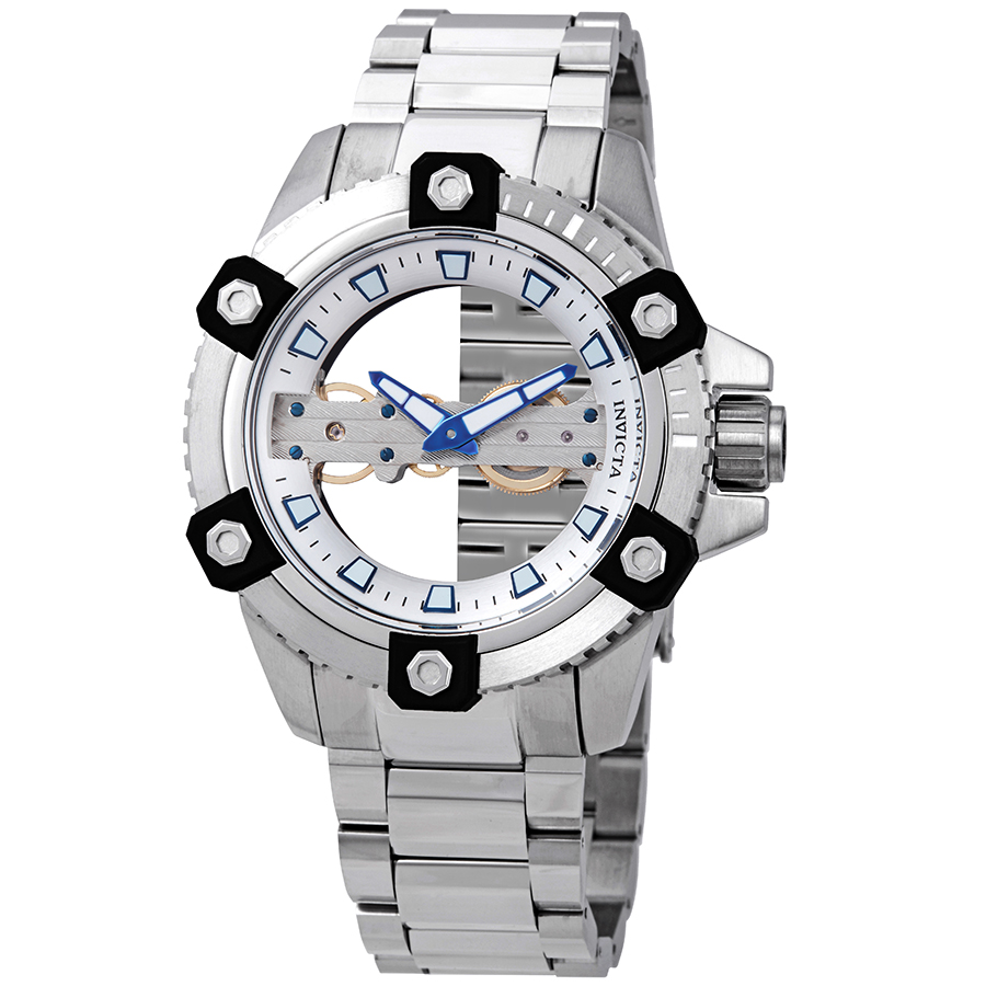 Silver-tone stainless steel case with a silver-tone stainless steel bracelet. Uni-directional rotating silver-tone stainless steel bezel. Silver-tone dial with blue hands and index hour markers. Dial Type: Analog. Luminescent hands and markers. Caliber JQ-R005 (Nickel) hand wind movement. Scratch resistant flame fusion crystal. Pull / push crown. Transparent case back. Round case shape, case size: 48 mm, case thickness: 18 mm. Band width: 24 mm, band length: 8.25 inches. Fold over clasp. Water resistant at 100 meters / 330 feet. Functions: hour, minute. Dress watch style. Invicta Reserve Hand Wind Bridge Silver Dial Mens Watch 26485.