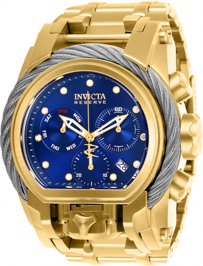 Gold-tone stainless steel case with a gold-tone stainless steel bracelet. Fixed two-tone (silver-tone and gold-tone) stainless steel bezel. Blue dial with gold-tone hands and index hour markers. Minute markers around the outer rim. Dial Type: Analog. Luminescent hands and markers. Date display between 4 and 5 o'clock position. Chronograph - three sub-dials displaying: 60 second, 30 minute and 1/10th of a second. Ronda Caliber 1042 quartz movement. Scratch resistant flame fusion crystal. Solid case back. Round case shape. Case size: 52 mm. Band width: 34 mm. Deployment clasp. Water resistant at 200 meters / 660 feet. Functions: chronograph, date, hour, minute, second. Sport watch style. Watch label: Swiss Movt. Invicta Reserve Chronograph Blue Dial Mens Watch 26585.