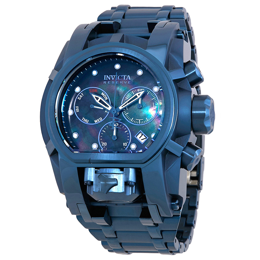 Blue stainless steel case with a blue stainless steel bracelet. Fixed blue stainless steel bezel. Mother of pearl dial with blue hands and index hour markers. Minute markers around the outer rim. Dial Type: Analog. Luminescent hands and markers. Date display at the 4 o'clock position. Chronograph - three sub-dials displaying: week, 60 second, 30 minute. Ronda Caliber Z60 quartz movement. Scratch resistant flame fusion crystal. Pull / push crown. Solid case back. Round case shape, case size: 52 mm, case thickness: 20 mm. Band width: 34 mm, band length: 8.5 inches. Fold over clasp. Water resistant at 200 meters / 660 feet. Functions: chronograph, date, day, hour, minute, small second. Sport watch style. Watch label: Swiss Movt. Invicta Reserve Chronograph Mens Watch 26708.