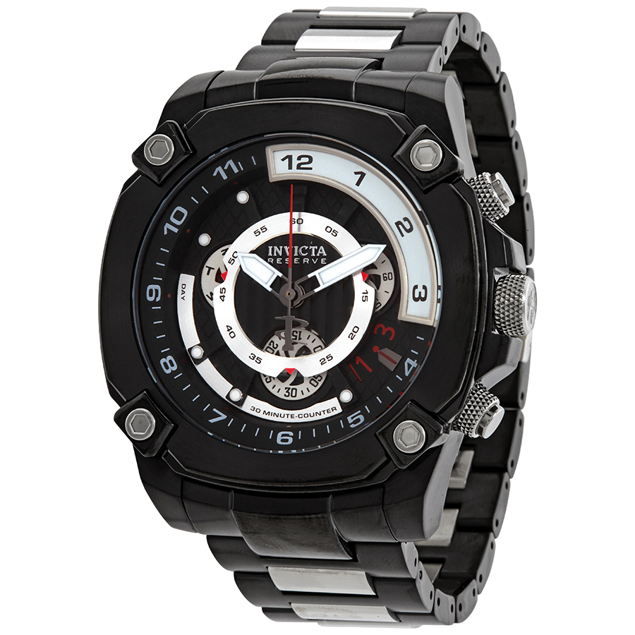 Black stainless steel case with a two-tone (black/silver-tone) stainless steel bracelet. Fixed black stainless steel bezel. Black dial with silver-tone hands and Arabic numeral hour markers. Minute markers on inner rim. Dial Type: Analog. Luminescent hands. Date display at the 4 o'clock position, day on subdial at 10 o'clock position. Chronograph - sub-dials displaying: three - week, 60 second, 30 minute. Ronda Caliber Z60 quartz movement. Scratch resistant flame fusion crystal. Pull / push crown. Solid case back. Round case shape. Case size: 50 mm. Band width: 26 mm, band length: 8.5 inches. Fold over with safety release clasp. Water resistant at 100 meters / 330 feet. Functions: chronograph, date, day, hour, minute, small second. Sport watch style. Watch label: Swiss Movt. Invicta Reserve Chronograph Black Dial Two-Tone Mens Watch 27051.