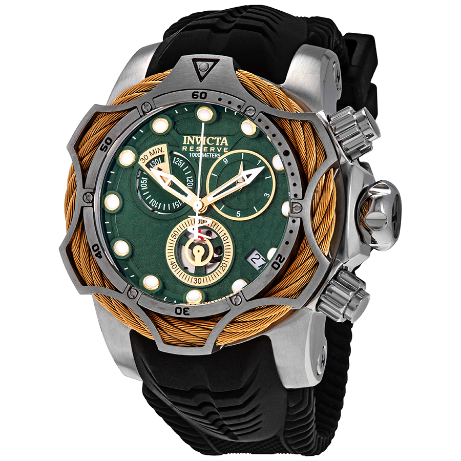 Stainless steel case with a black rubber strap. Uni-directional rotating stainless steel bezel with gold-tone cable wire trim. Green dial with luminous yelloiw gold-tone hands and dot hour markers. Minute markers around the outer rim. Dial Type: Analog. Luminescent hands and markers. Date display between the 4 and 5 o'clock positions. Chronograph - three sub-dials displaying: 60 second, 30 minute and 1/10th of a second. ETA caliber G10.211 quartz movement. Scratch resistant mineral crystal. Screw down crown. Solid case back. Round case shape. Case size: 52.5 mm. Case thickness: 23 mm. Band width: 26 mm. Band length: 8.25 inches. Tang clasp. Water resistant at 1000 meters / 3300 feet. Functions: chronograph, date, hour, minute, second. Dive watch style. Watch label: Swiss Movt. Invicta Reserve Chronograph Quartz Green Dial Mens Watch 27710.
