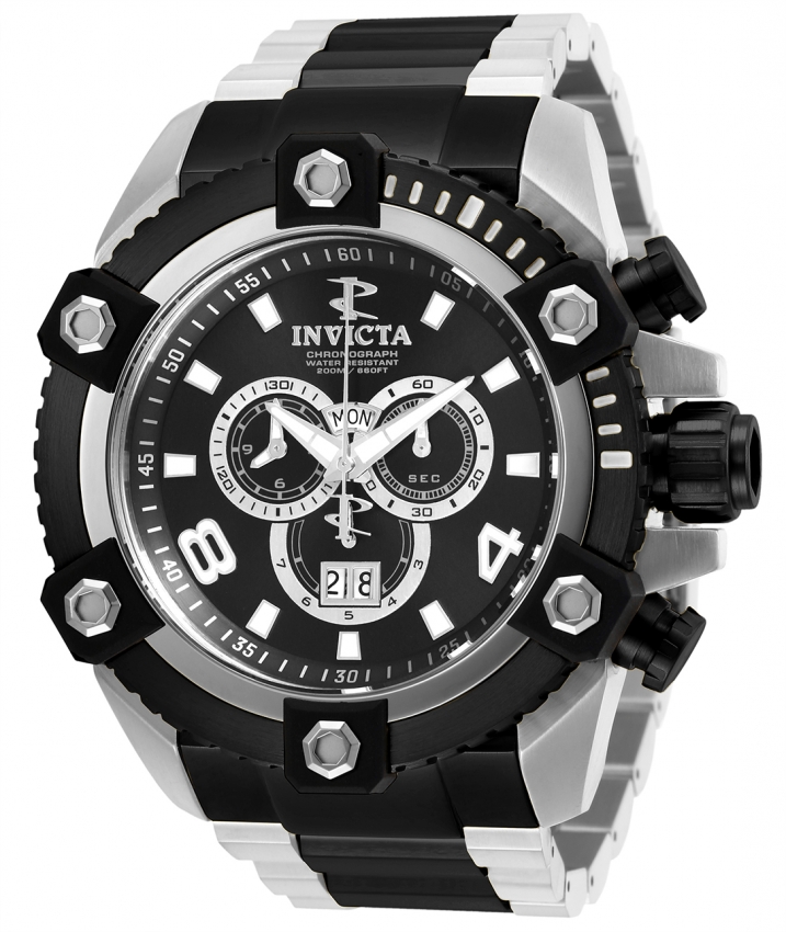 Silver-tone stainless steel case with a two-tone (black and silver-tone) stainless steel bracelet. Uni-directional rotating two-tone (black and silver-tone) stainless steel bezel. Black dial with silver-tone hands and index hour markers. Minute markers around the outer rim. Dial Type: Analog. Luminescent hands and markers. Date display at the 6 o'clock position. Chronograph - three sub-dials displaying: 60 second, dual 12 hour / 30 minute and 1/10th of a second. Ronda Caliber 5050.C quartz movement. Scratch resistant flame fusion crystal. Pull / push crown. Solid case back. Round case shape, case size: 56 mm, case thickness: 17 mm. Band width: 31 mm, band length: 8.75 inches. Fold over clasp. Water resistant at 200 meters / 660 feet. Functions: chronograph, big date, day, hour, minute, small second. Sport watch style. Watch label: Swiss Movt. Invicta Reserve Chronograph Quartz Black Dial Mens Watch 29540.