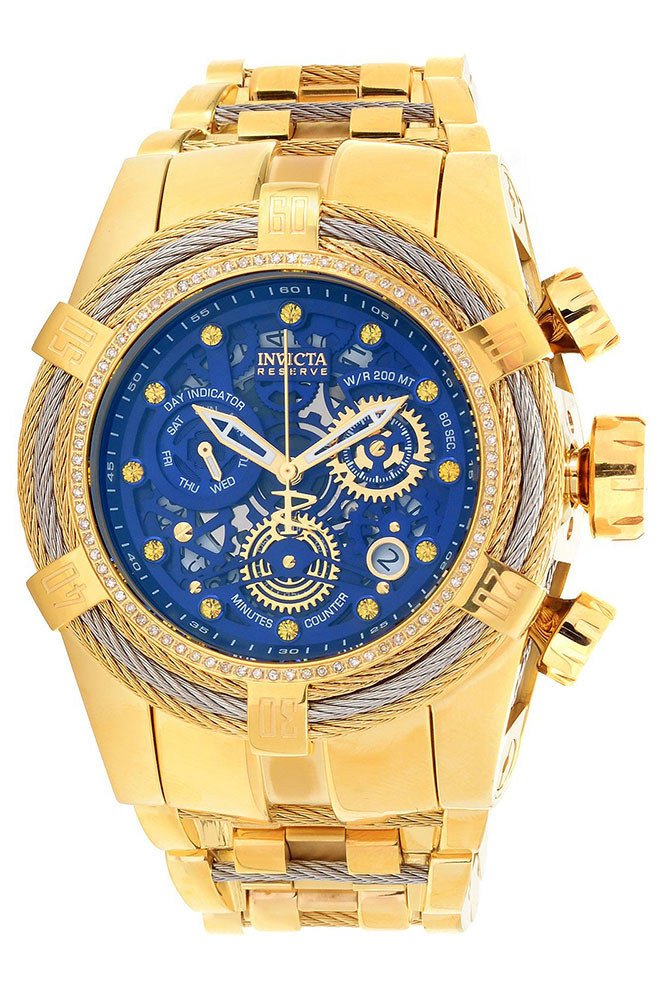 Yellow gold-tone stainless steel case with a yellow gold-tone stainless steel bracelet with silver-tone and gold-tone cable wire trim. Uni-directional rotating yellow gold-tone crystal-set bezel with silver-tone and gold-tone cable wire trim. Blue cut-out dial with yellow gold-tone skeleton sword-shaped hands and crystal hour markers. Minute markers around the outer rim. Dial Type: Analog. Luminescent hands. Date display between the 4 and 5 o'clock positions. Chronograph - two sub-dials displaying: 60 second and 30 minute. Day of the week sub-dial. Ronda caliber Z60 quartz movement. Scratch resistant flame fusion crystal. Screw down crown. Solid case back. Round case shape. Case size: 53 mm. Case thickness: 21.9 mm. Band width: 35 mm. Band length: 8.25 inches. Fold over clasp. Water resistant at 200 meters / 660 feet. Functions: chronograph, date, day, hour, minute, small second. Reserve Series. Sport watch style. Watch label: Swiss Movt. Invicta Reserve Chronograph Quartz Blue Dial Mens Watch 30069.