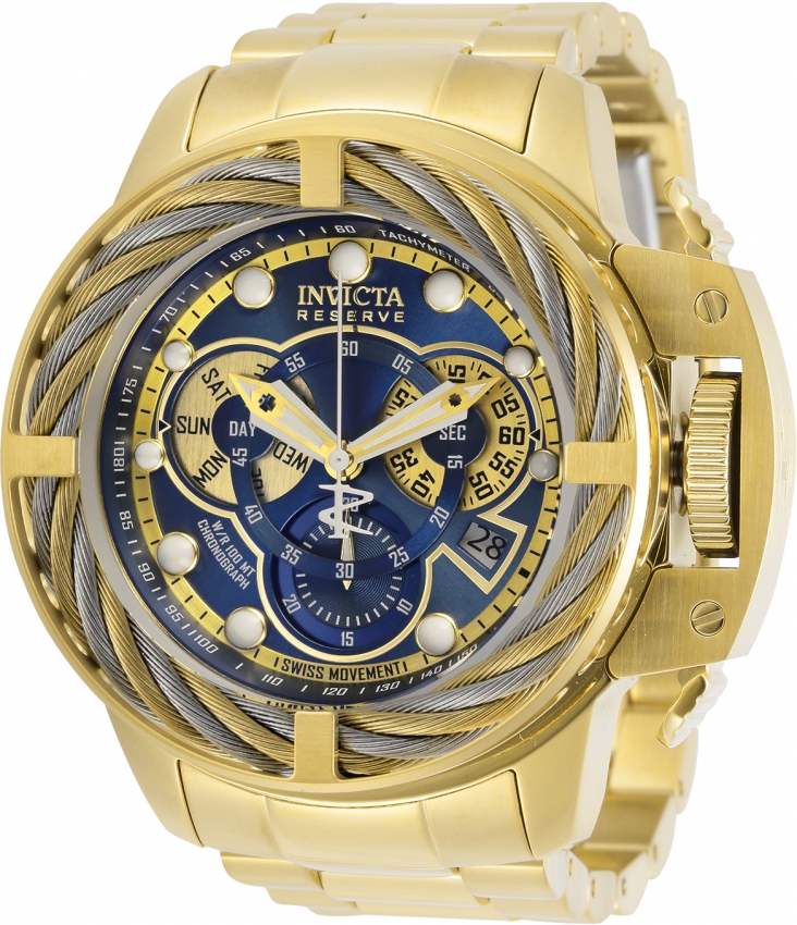 Two-tone (silver-tone and gold-tone) stainless steel case with a gold-tone stainless steel bracelet. Uni-directional rotating gold-tone and silver-tone stainless steel bezel. Blue and gold dial with gold-tone hands and index hour markers. Tachymeter scale around the outer rim. Dial Type: Analog. Luminescent hands and markers. Date display at the 4 o'clock position. Chronograph - three sub-dials displaying: week, 60 second, 30 minute. Ronda Caliber Z60 quartz movement. Scratch resistant flame fusion crystal. Screw down crown. Solid case back. Round case shape, case size: 50.5 mm, case thickness: 22 mm. Band width: 26 mm, band length: 8.25 inches. Fold over clasp. Water resistant at 500 meters / 1650 feet. Functions: chronograph, date, day, hour, minute, small second. Dive watch style. Watch label: Swiss Movt. Invicta Reserve Chronograph Quartz Mens Watch 30128.