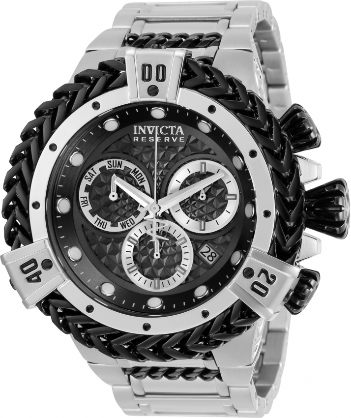 Stainless steel case with a stainless steel bracelet with black olive branch inserst. Uni-directional rotating stainless steel bezel surrounded by black olive branch chain links. Gunmetal dial with luminous silver-tone hands and dot hour markers. Minute markers around the outer rim. Dial Type: Analog. Luminescent hands and markers. Date display between the 4 and 5 o'clock positions. Chronograph - two sub-dials displaying: 60 second and 30 minute. Day of the week sub-dial. Ronda caliber Z60 quartz movement. Scratch resistant Flame Fusion crystal. Screw down crown. Solid case back. Round case shape. Case size: 53 mm. Case thickness: 19.25 mm. Band width: 31 mm. Band length: 8.25 inches. Fold over clasp. Water resistant at 200 meters / 660 feet. Functions: chronograph, date, day, hour, minute, small second. Reserve Series. Sport watch style. Watch label: Swiss Movt. Invicta Reserve Chronograph Quartz Gunmetal Dial Mens Watch 30541.