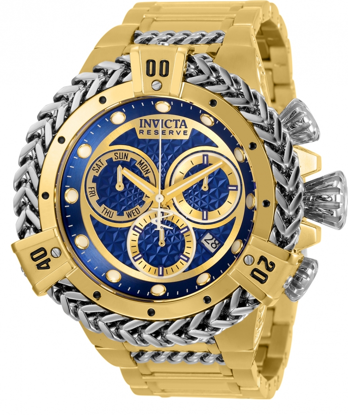 Yellow gold-tone stainless steel case and bracelet. Uni-directional rotating yellow gold-tone bezel with heavy chain trim. Blue dial with luminous yellow gold-tone hands and dot hour markers. Minute markers around the outer rim. Dial Type: Analog. Luminescent hands and markers. Date display between the 4 and 5 o'clock positions. Chronograph - two sub-dials displaying: 60 second and 30 minute. Day of the week sub-dial. Ronda caliber Z60 quartz movement. Scratch resistant flame fusion crystal. Screw down crown. Solid case back. Round case shape. Case size: 53 mm. Case thickness: 19.25 mm. Band width: 31 mm. Band length: 8.25 inches. Fold over clasp. Water resistant at 200 meters / 660 feet. Functions: chronograph, date, day, hour, minute, small second. Sport watch style. Watch label: Swiss Movt. Invicta Reserve Chronograph Quartz Blue Dial Mens Watch 30544.