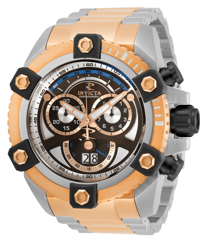 Rose gold and black and silver-tone stainless steel case with a silver-tone and rose gold stainless steel bracelet. Uni-directional rotating rose gold-tone and silver-tone stainless steel bezel. Blue and silver and brown dial with rose gold-tone hands and Arabic numeral hour markers. Minute markers around the outer rim. Dial Type: Analog. Luminescent hands. Date display at the 6 o'clock position. Chronograph - four sub-dials displaying: 60 second, 30 minute and 1/10th of a second, retrograde day. Ronda Caliber 8040.N quartz movement. Scratch resistant flame fusion crystal. Pull / push crown. Solid case back. Round case shape, case size: 56 mm, case thickness: 18 mm. Band width: 31 mm, band length: 8.75 inches. Fold over clasp. Water resistant at 200 meters / 660 feet. Functions: chronograph, retrograde, big date, day, hour, minute, small second. Reserve Series. Sport watch style. Watch label: Swiss Movt. Invicta Reserve Chronograph Quartz Mens Watch 31418.
