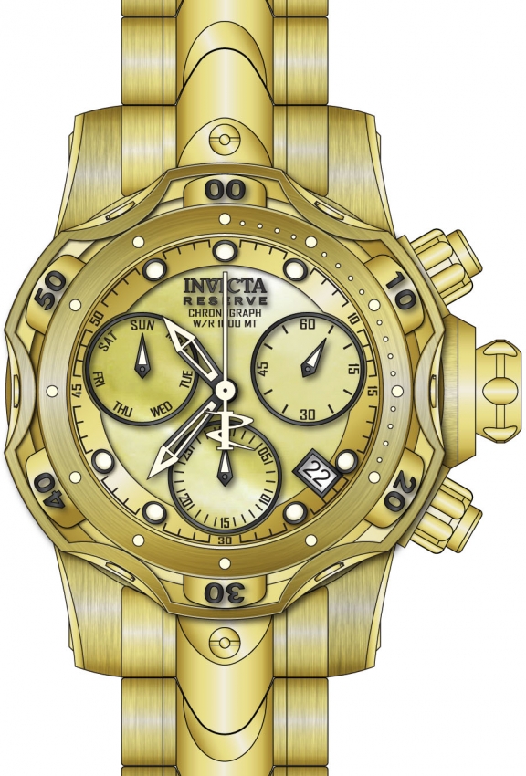Yellow gold-tone stainless steel case and bracelet. Uni-directional rotating yellow gold-tone bezel with a gold aluminum ring. Champagne dial with gunmetal sword-shaped skeleton hands and index hour markers. Minute markers around the outer rim. Dial Type: Analog. Luminescent hands and markers. Date display between 4 and 5 o'clock position. Two sub-dials displaying: 60 second and 30 minute. Day of the week sub-dial. Ronda caliber Z60 quartz movement. Scratch resistant Flame Fusion crystal. Screw down crown. Solid case back. Round case shape. Case size: 44.4 mm. Case thickness: 22 mm. Band width: 20 mm. Band length: 7.25 inches. Fold over clasp. Water resistant at 1000 meters / 3300 feet. Functions: chronograph, date, day, hour, minute, small second. Reserve Series. Dive watch style. Watch label: Swiss Movt. Invicta Reserve Chronograph Quartz Champagne Dial Ladies Watch 31601.