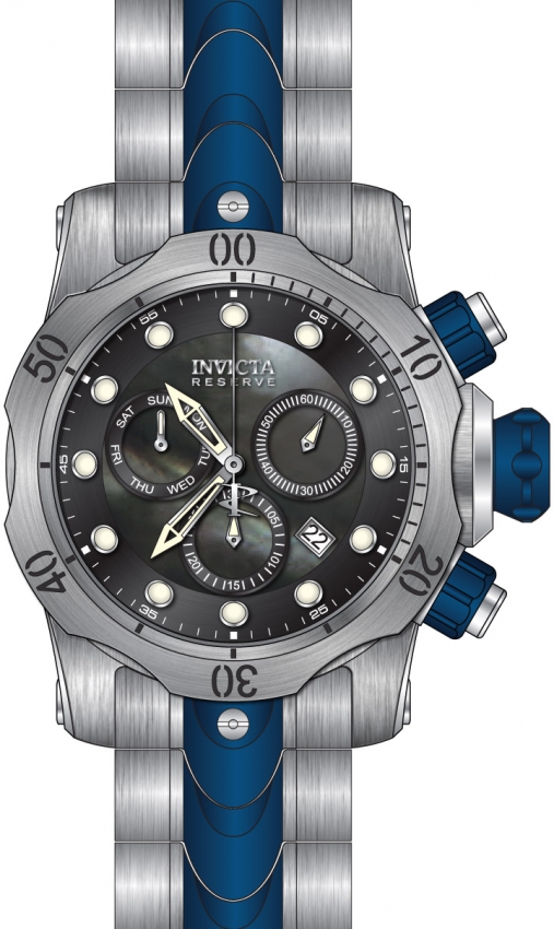 Stainless steel case with a two-tone (silver-tone and dark blue-plated) stainless steel bracelet. Uni-directional rotating stainless steel bezel. Black mother of pearl dial with silver-tone skeleton sword-shaped hands and dot hour markers. Minute markers around the outer rim. Dial Type: Analog. Luminescent hands and markers. Date display between the 4 and 5 o'clock positions. Chronograph - two sub-dials displaying: 60 second and 30 minute. Day of the week sub-dial. Ronda caliber Z60 quartz movement. Scratch resistant Flame Fusion crystal. Screw down crown. Solid case back. Round case shape. Case size: 53.7 mm. Case thickness: 21 mm. Band width: 26 mm. Band length: 8.25 inches. Fold over with safety release clasp. Water resistant at 1000 meters / 3300 feet. Functions: chronograph, date, day, hour, minute, small second. Reserve Series. Dive watch style. Watch label: Swiss Movt. Invicta Reserve Chronograph Quartz Black Dial Mens Watch 32125.