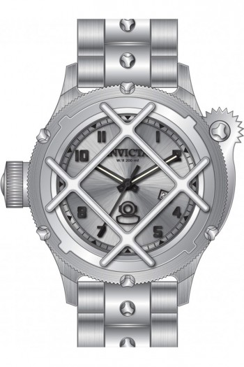 Silver-tone stainless steel case with a silver-tone stainless steel bracelet. Fixed silver-tone stainless steel bezel. Silver-tone dial with black hands and Arabic numeral hour markers. Minute markers around the outer rim. Dial Type: Analog. Date display between 3 and 4 o'clock position. Ronda Caliber 515 quartz movement. Scratch resistant mineral crystal. Screw down crown. Solid case back. Round case shape, case size: 52 mm, case thickness: 22 mm. Band width: 26 mm, band length: 8 inches. Deployment with safety clasp. Water resistant at 200 meters / 660 feet. Functions: date, hour, minute, second. Casual watch style. Watch label: Swiss Movt. Invicta Russian Diver Silver Dial Mens Watch 26465.