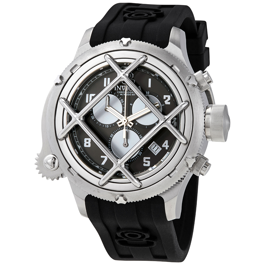 Silver-tone stainless steel case with a black silicone strap. Fixed coin edge silver-tone stainless steel bezel. Black dial with silver-tone hands and Arabic numeral hour markers. Minute markers around the outer rim. Dial Type: Analog. Luminescent hands. Date display between 4 and 5 o'clock position. Chronograph - three sub-dials displaying: 60 second, 30 minute and 10 hour. ETA Caliber G10.211 quartz movement. Scratch resistant mineral crystal. Screw down canteen style crown. Solid case back. Round case shape, case size: 52 mm, case thickness: 20.8 mm. Band width: 26 mm, band length: 8.25 inches. Buckle clasp. Water resistant at 200 meters / 660 feet. Functions: chronograph, rattrapante, date, hour, minute, small second. Additional Info: decorated with a cage. Sport watch style. Watch label: Swiss Movt. Invicta Russian Diver Chronograph Quartz Black Dial Mens Watch 27723.