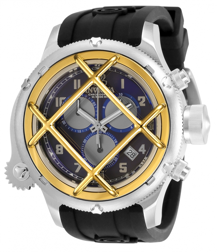 Silver-tone stainless steel case with a black silicone strap. Fixed gold and steel stainless steel bezel. Blue and silver dial with silver-tone hands and Arabic numeral hour markers. Minute markers around the outer rim. Dial Type: Analog. Luminescent hands and markers. Date display between 4 and 5 o'clock position. Chronograph - sub-dials displaying: three - 60 second, 30 minute and 10 hour. ETA Caliber G10.211 quartz movement. Scratch resistant mineral crystal. Screw down crown. Solid case back. Round case shape, case size: 52 mm, case thickness: 20.8 mm. Band width: 26 mm, band length: 8.25 inches. Buckle clasp. Water resistant at 200 meters / 660 feet. Functions: chronograph, rattrapante, date, hour, minute, small second. Sport watch style. Watch label: Swiss Movt. Invicta Russian Diver Chronograph Quartz Mens Watch 27729.
