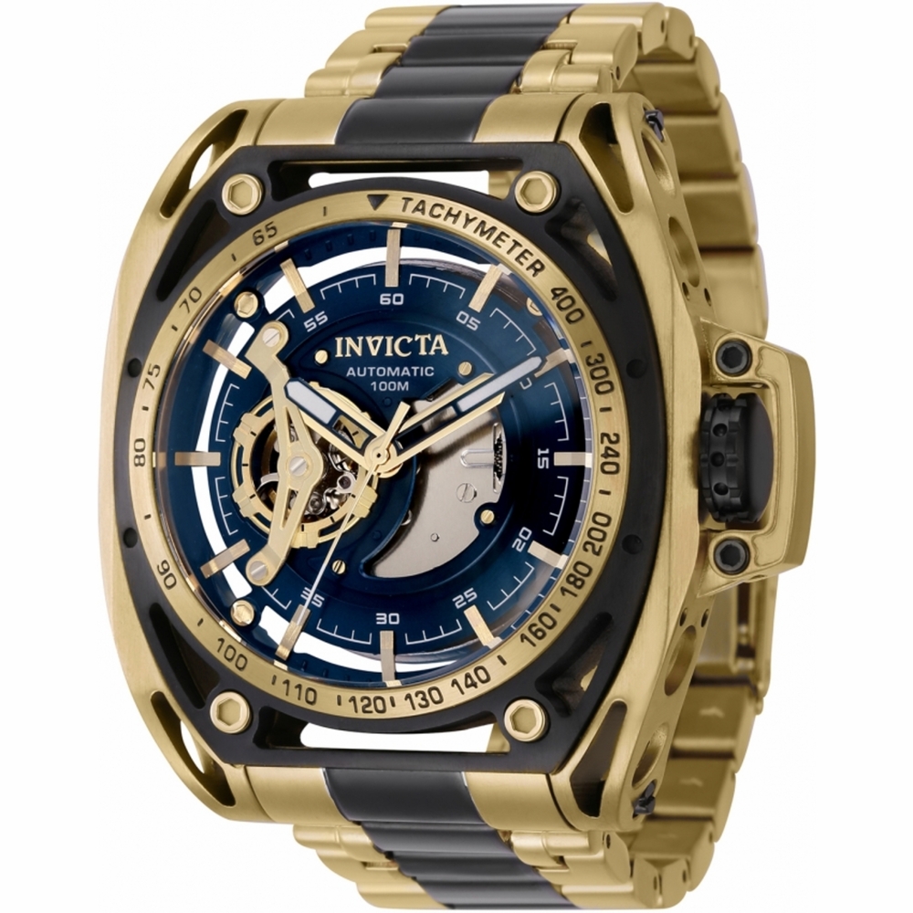 Two-tone (black and gold-tone) stainless steel case and bracelet. Fixed gold-tone stainless steel bezel. Blue dial with gold-tone hands and index hour markers. Minute markers around the outer rim. Dial Type: Analog. Luminescent hands and markers. TMI Caliber NH38 Automatic movement, containing 24 Jewels, bitting at 21600 vph, and has a power reserve of approximately 41 hours. Scratch resistant Flame Fusion crystal. Pull / push crown. Transparent see through case back. Round case shape, case size: 51 mm. Band width: 26 mm, band length: 7.50 inches. Fold over clasp. Water resistant at 100 meters / 330 feet. Functions: hour, minute, second. S1 Rally Series. Casual watch style. Watch label: Japan Movt. Invicta S1 Rally Blue Dial Mens Watch 38147.