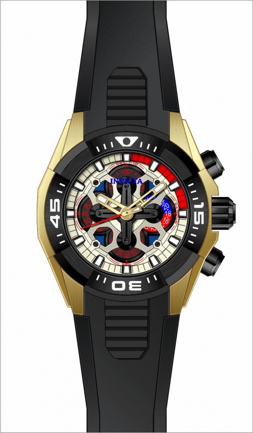 Two-tone (black and gold-tone) stainless steel case with a black silicone strap. Black stainless steel bezel. Blue and ivory dial with gold-tone hands and index hour markers. Minute markers around the outer rim. Dial Type: Analog. Luminescent hands and markers. Chronograph - four sub-dials displaying: 60 second, 30 minute and 1/10th of a second, 24 hour. Hattori Caliber VD56 quartz movement. Scratch resistant Flame Fusion crystal. Pull / push crown. Solid case back. Round case shape, case size: 48 mm. Band width: 24 mm, band length: 8.75 inches. Buckle clasp. Water resistant at 100 meters / 330 feet. Functions: chronograph, GMT, second time zone, hour, minute, second. S1 Rally Series. Sport watch style. Watch label: Japan Movt. Invicta S1 Rally Chronograph Quartz Mens Watch 30319.