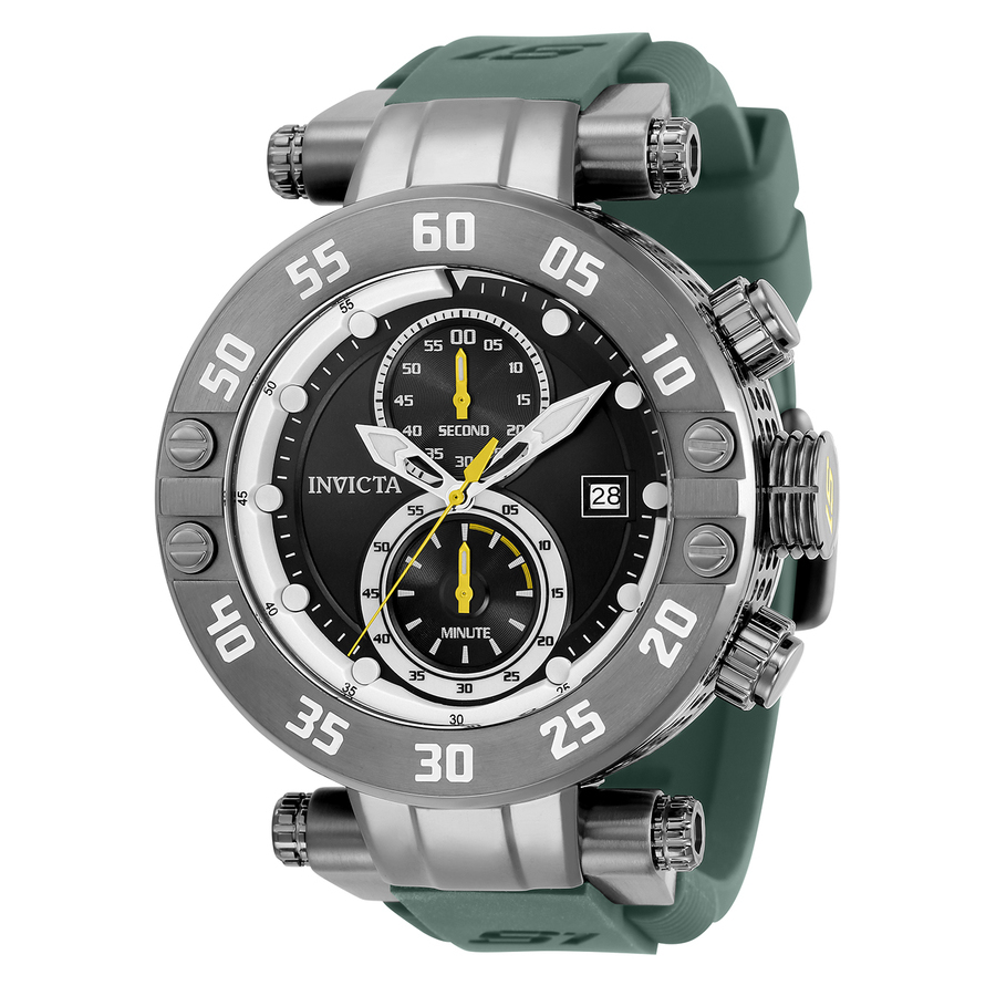 Gunmetal-plated stainless steel case with a dark green silicone strap. Fixed gunmetal-plated bezel. Dark green dial with luminous silver-tone hands and dot hour markers. Minute markers. Arabic numeral minute markers (at 5 minute intervals) around the outer rim. Dial Type: Analog. Luminescent hands and markers. Date display at the 3 o'clock position. Chronograph - two sub-dials displaying: 60 second and 60 minute. Hattori caliber VD51 quartz movement. Scratch resistant Flame Fusion crystal. Pull / push crown. Solid case back. Round case shape. Case size: 48 mm. Case thickness: 16.1 mm. Band width: 26 mm. Band length: 7.75 inches. Tang clasp. Water resistant at 100 meters / 330 feet. Functions: chronograph, date, hour, minute, second. S1 Rally Series. Sport watch style. Watch label: Japan Movt. Invicta S1 Rally Chronograph Quartz Mens Watch 34800.