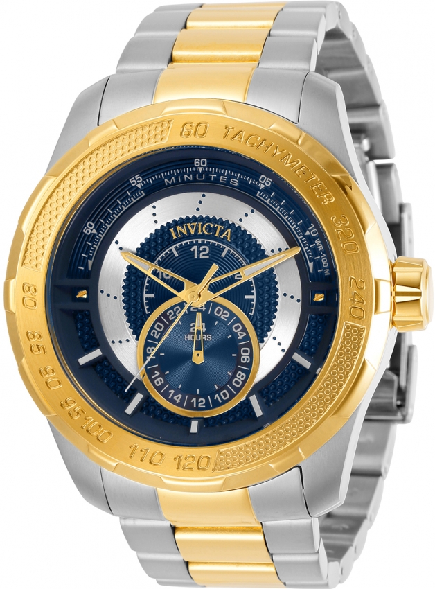 Stainless steel case with a two-tone (silver-tone and yellow gold-tone) stainless steel bracelet. Fixed yellow gold-tone bezel showing tachymeter markings. Blue and silver dial with gold-tone hands and alternating Arabic numeral and index hour markers. Minute markers around the outer rim. Dial Type: Analog. Luminescent hands and markers. 24 hour (GMT) sub-dial. Miyota caliber 6P28 quartz movement. Scratch resistant Flame Fusion crystal. Pull / push crown. Solid case back. Round case shape. Case size: 50 mm. Case thickness: 11 mm. Band width: 26 mm. Band length: 7.25 inches. Fold over clasp. Water resistant at 100 meters / 330 feet. Functions: GMT, second time zone, hour, minute, second. S1 Rally Series. Sport watch style. Watch label: Japan Movt. Invicta S1 Rally Quartz Blue and Silver Dial Mens Watch 30570.
