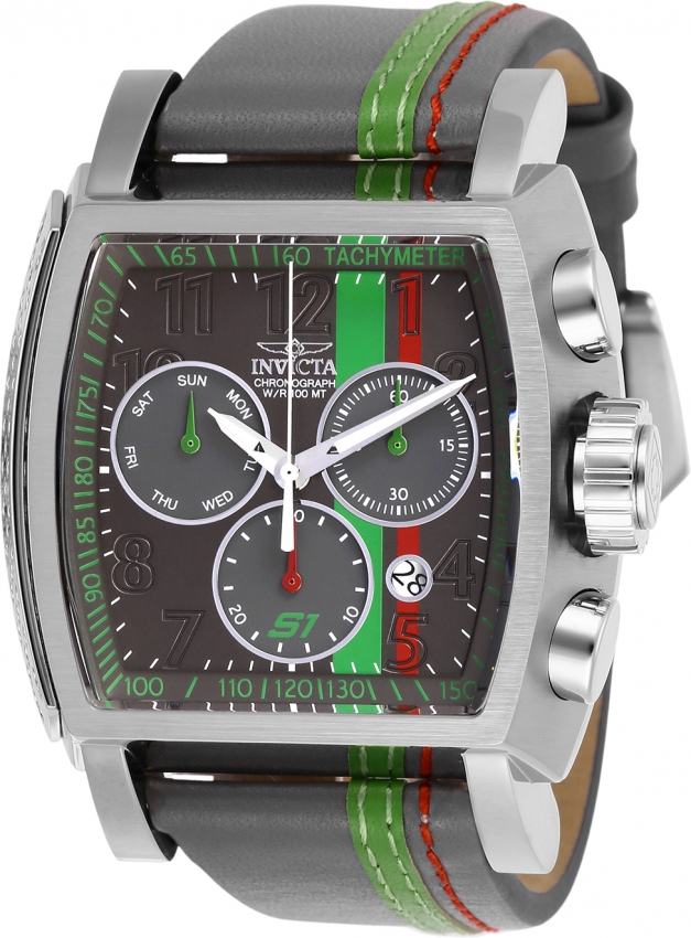 Silver-tone stainless steel case with a grey, green, red leather strap. Fixed silver-tone stainless steel bezel. Grey dial with silver-tone hands and index hour markers. Tachymeter scale around the outer rim. Dial Type: Analog. Luminescent hands. Date display between 4 and 5 o'clock position. Chronograph - three sub-dials displaying: week, 60 second, 30 minute. Ronda Caliber Z60 quartz movement. Scratch resistant mineral crystal. Pull / push crown. Solid case back. Tonneau case shape, case size: 47 mm x 50 mm, case thickness: 17 mm. Band width: 26 mm, band length: 9.25 inches. Buckle clasp. Water resistant at 100 meters / 330 feet. Functions: chronograph, date, day, hour, minute, small second. Sport watch style. Watch label: Swiss Movt. Invicta S1 Rally Chronograph Grey Dial Mens Watch 26395.