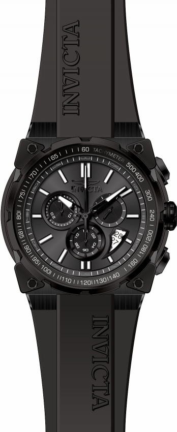 Black-plated stainless steel case with a black silicone strap. Fixed black-plated bezel showing tachymeter markings. Black dial with luminous black hands and index hour markers. Minute markers around the outer rim. Dial Type: Analog. Luminescent hands and markers. Date display at the 4 o'clock position. Chronograph - three sub-dials displaying: 60 second, 30 minute and 12 hour. Ronda caliber 5030.D quartz movement. Scratch resistant flame fusion crystal. Pull / push crown. Solid case back. Round case shape. Case size: 47 mm. Case thickness: 14 mm. Band width: 22 mm. Band length: 8.75 inches. Tang clasp. Water resistant at 100 meters / 330 feet. Functions: chronograph, tachymeter, date, hour, minute, small second. Sport watch style. Watch label: Swiss Movt. Invicta S1 Rally Chronograph Quartz Black Dial Mens Watch 27332.