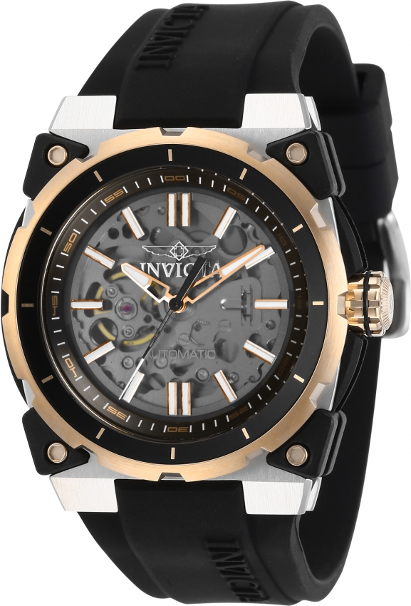 Silver-tone stainless steel case with a black silicone strap. Fixed gold-tone stainless steel bezel. Black dial with gold-tone hands and index hour markers. Minute markers around the outer rim. Dial Type: Analog. Luminescent hands and markers. TMI Caliber NH70 automatic movement. Scratch resistant flame fusion crystal. Pull / push crown. Round case shape, case size: 46 mm, case thickness: 13.2 mm. Band width: 22 mm, band length: 8.75 inches. Buckle clasp. Water resistant at 100 meters / 330 feet. Functions: hour, minute, second. Dress watch style. Watch label: Japan Movt. Invicta S1 Rally Automatic Black Dial Mens Watch 27334.
