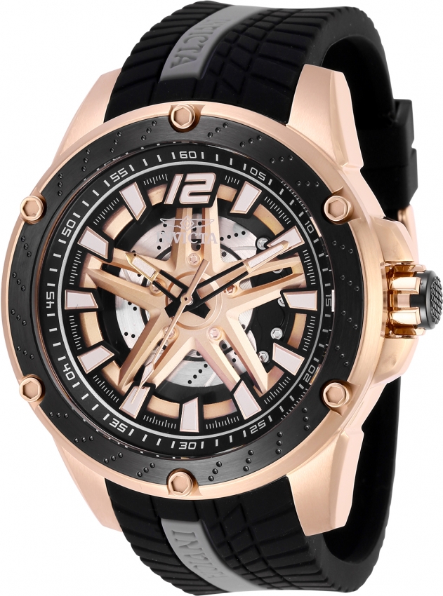 Gold-tone stainless steel case with a two-tone (black and grey) silicone and polyurethane strap. Black and rose gold stainless steel bezel. Gold-tone dial with gold-tone hands and Arabic numeral and index hour markers. Minute markers around the outer rim. Dial Type: Analog. Luminescent hands and markers. SII Caliber NH35A automatic movement with a 41-hour power reserve. Scratch resistant flame fusion crystal. Pull / push crown. Transparent case back. Round case shape, case size: 50 mm, case thickness: 18 mm. Band width: 24 mm, band length: 7.75 inches. Buckle clasp. Water resistant at 100 meters / 330 feet. Functions: hour, minute, second. Casual watch style. Watch label: Japan Movt. Invicta S1 Rally Automatic Gold Dial Mens Watch 28303.