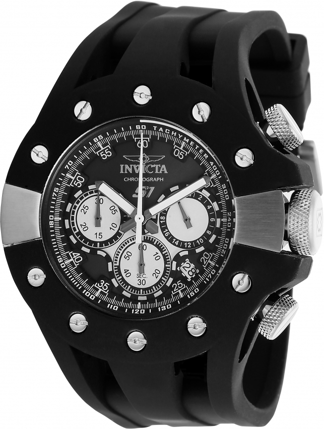 Black stainless steel case with a black silicone strap. Fixed black stainless steel bezel. Black dial with silver-tone hands and Arabic numeral hour markers. Tachymeter scale around the outer rim. Dial Type: Analog. Luminescent hands. Date display between 4 and 5 o'clock position. Chronograph - sub-dials displaying: three - 60 second, 60 minute and 24 hour. Hattori Caliber VD53 quartz movement. Scratch resistant mineral crystal. Pull / push crown. Solid case back. Round case shape, case size: 49 mm, case thickness: 17 mm. Band width: 26 mm, band length: 8.25 inches. Buckle clasp. Water resistant at 100 meters / 330 feet. Functions: chronograph, date, GMT, second time zone, hour, minute, second. Sport watch style. Watch label: Japan Movt. Invicta S1 Rally Chronograph Black Dial Mens Watch 28565.