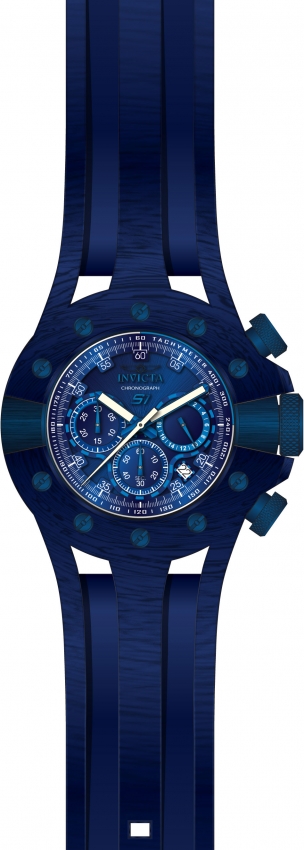 Blue stainless steel case with a blue silicone strap. Fixed blue stainless steel and plastic bezel. Blue dial with blue hands and Arabic numeral hour markers. Minute markers around the outer rim. Dial Type: Analog. Luminescent hands. Date display between 4 and 5 o'clock position. Chronograph - sub-dials displaying: three - 60 second, 60 minute and 24 hour. Hattori Caliber VD53 quartz movement. Scratch resistant mineral crystal. Pull / push crown. Solid case back. Round case shape, case size: 49 mm, case thickness: 17 mm. Band width: 26 mm, band length: 8.25 inches. Buckle clasp. Water resistant at 100 meters / 330 feet. Functions: chronograph, date, GMT, second time zone, hour, minute, second. Sport watch style. Watch label: Japan Movt. Invicta S1 Rally Chronograph Blue Dial Mens Watch 28574.