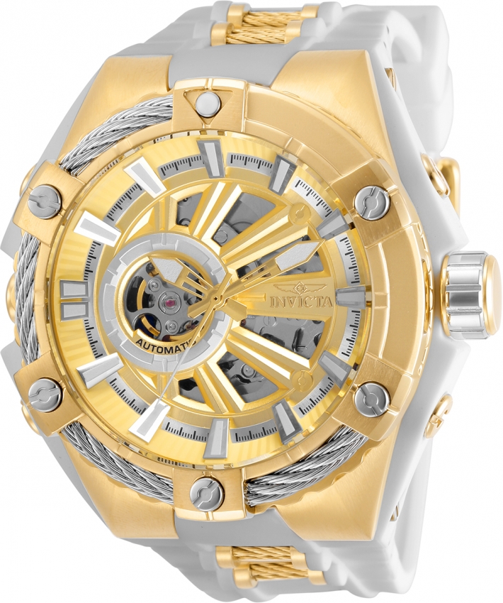 Gold-tone stainless steel case with a white silicone and polyurethane strap with gold-tone barrel inserts. Fixed gold-tone bezel with silver-tone cable wire trim. Gold skeleton (open heart) dial with luminous gold-tone hands and index hour markers. Minute markers around the outer rim. Dial Type: Analog. Luminescent hands and markers. TMI caliber NH38 automatic movement, containing 24 Jewels, bitting at 21600 vph, and has a power reserve of approximately 41 hours. Scratch resistant flame fusion crystal. Pull / push crown. Transparent case back. Round case shape. Case size: 51 mm. Case thickness: 18 mm. Band width: 46 mm. Band length: 8 inches. Tang clasp. Water resistant at 100 meters / 330 feet. Functions: hour, minute, second. Casual watch style. Watch label: Japan Movt. Invicta S1 Rally Automatic Gold Dial Open Heart Mens Watch 28858.