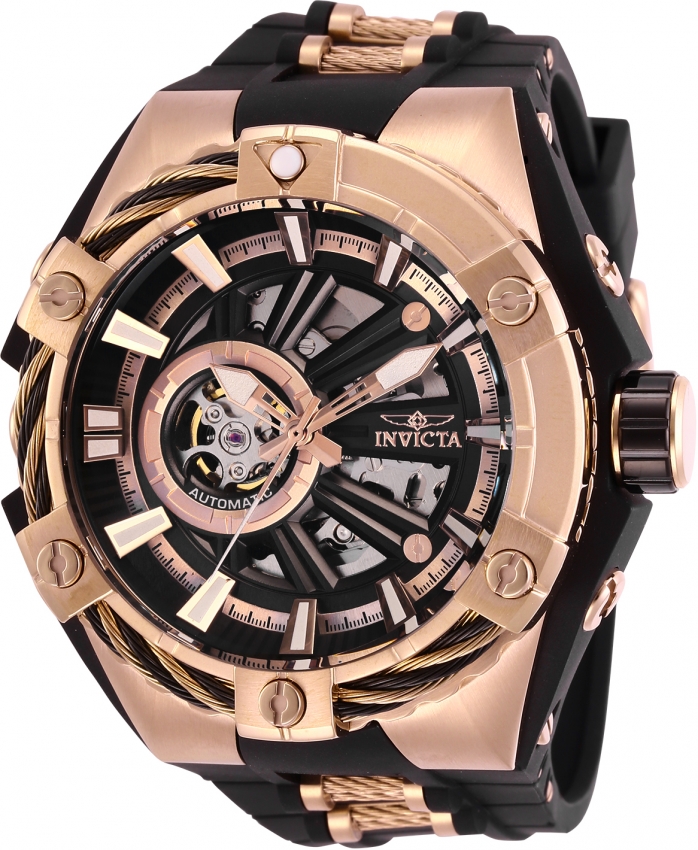Black ion-plated stainless steel case with a black silicone and polyurethane strap with rose gold-plated barrel inserts. Fixed rose gold-plated bezel with cable wire trim. Rose (open heart) dial with luminous rose gold-tone hands and index hour markers. Minute markers. Dial Type: Analog. Luminescent hands and markers. TMI caliber NH38 automatic movement, containing 24 Jewels, bitting at 21600 vph, and has a power reserve of approximately 41 hours. Scratch resistant flame fusion crystal. Pull / push crown. Transparent case back. Round case shape. Case size: 51 mm. Case thickness: 18 mm. Band width: 46 mm, band length: 8 inches. Tang clasp. Water resistant at 100 meters / 330 feet. Functions: date, day, hour, minute, second. Casual watch style. Watch label: Japan Movt. Invicta S1 Rally Automatic Rose Open Heart Dial Mens Watch 28861.