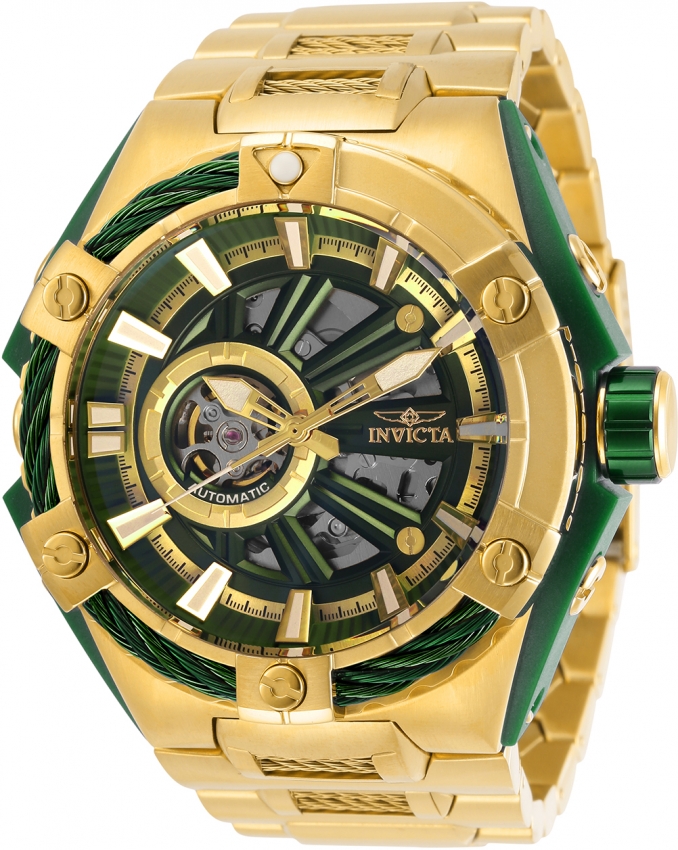 Gold-tone and green stainless steel case with a gold-tone stainless steel bracelet. Fixed gold-tone and green stainless steel and cable bezel. Green dial with gold-tone hands and index hour markers. Minute markers around the outer rim. Dial Type: Analog. Luminescent hands and markers. One - open heart subdial. TMI Caliber NH70 automatic movement with a 41-hour power reserve. Scratch resistant flame fusion crystal. Pull / push crown. Transparent case back. Round case shape, case size: 51 mm, case thickness: 18 mm. Band width: 33.5 mm, band length: 7.50 inches. Fold over clasp. Water resistant at 100 meters / 330 feet. Functions: hour, minute, second. Casual watch style. Watch label: Japan Movt. Invicta S1 Rally Automatic Green Dial Mens Watch 28869.