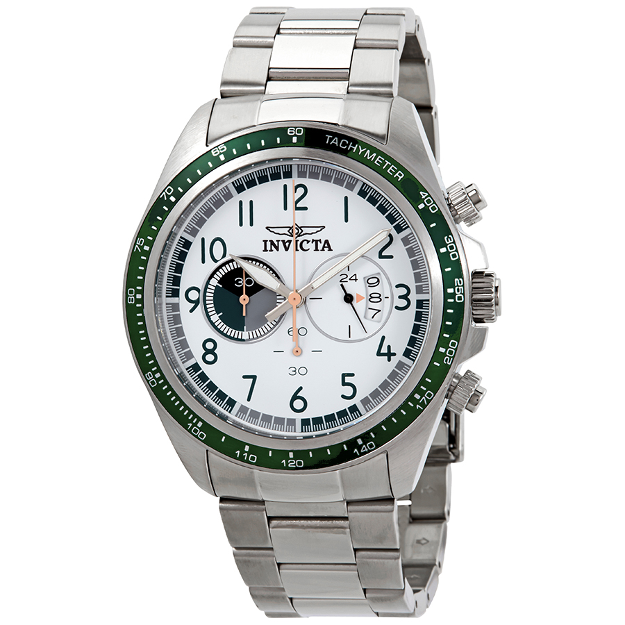 Silver-tone stainless steel case with a silver-tone stainless steel bracelet. Fixed with tachymeter scale green stainless steel bezel. White dial with silver-tone hands and Arabic numeral hour markers. Minute markers around the outer rim. Dial Type: Analog. Luminescent hands. Date display at the 3 o'clock position. Chronograph - three sub-dials displaying: 60 second, 60 minute and 24 hour. Hattori Caliber VD53 quartz movement. Scratch resistant flame fusion crystal. Pull / push crown. Solid case back. Round case shape, case size: 50 mm, case thickness: 13 mm. Band width: 26 mm, band length: 8 inches. Fold over clasp. Water resistant at 100 meters / 330 feet. Functions: chronograph, date, GMT, second time zone, hour, minute, second. Sport watch style. Watch label: Japan Movt. Invicta S1 Rally Chronograph White Dial Mens Watch 29022.