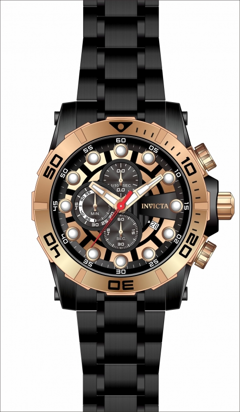 Black stainless steel case with a black stainless steel bracelet. Uni-directional rotating stainless steel bezel with a rose gold-tone count-up elapsed time top ring. Black dial with rose gold-tone hands and index hour markers. Minute markers around the outer rim. Dial Type: Analog. Luminescent hands and markers. Date display at the 4 o'clock position. Chronograph - three sub-dials displaying: 60 second, 60 minute and 1/10th of a second. Hattori Caliber VD57 quartz movement. Scratch resistant flame fusion crystal. Pull / push crown. Solid case back. Round case shape, case size: 54 mm, case thickness: 16 mm. Band width: 26 mm, band length: 8.75 inches. Fold over clasp. Water resistant at 200 meters / 660 feet. Functions: chronograph, date, hour, minute, second. Sea Hunter Series. Sport watch style. Watch label: Japan Movt. Invicta Sea Hunter Chronograph Quartz Black Dial Mens Watch 28267.
