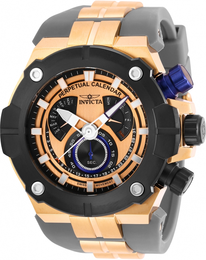 Rose gold and black stainless steel case with a grey silicone strap. Fixed black stainless steel bezel. Black and rose gold dial with silver-tone hands and index hour markers. Minute markers around the outer rim. Dial Type: Analog. Luminescent hands and markers. Perpetual calendar. Chronograph - sub-dials displaying: three - month, day, small second. ETA Caliber G15.562 quartz movement. Scratch resistant flame fusion crystal. Screw down crown. Solid case back. Round case shape, case size: 52 mm, case thickness: 16.5 mm. Band width: 31 mm, band length: 9 inches. Buckle clasp. Water resistant at 200 meters / 660 feet. Functions: perpetual calendar, chronograph, retrograde, month, date, day, hour, minute, small second. Sport watch style. Watch label: Swiss Movt. Invicta Sea Hunter Perpetual Chronograph Quartz Mens Watch 29955.