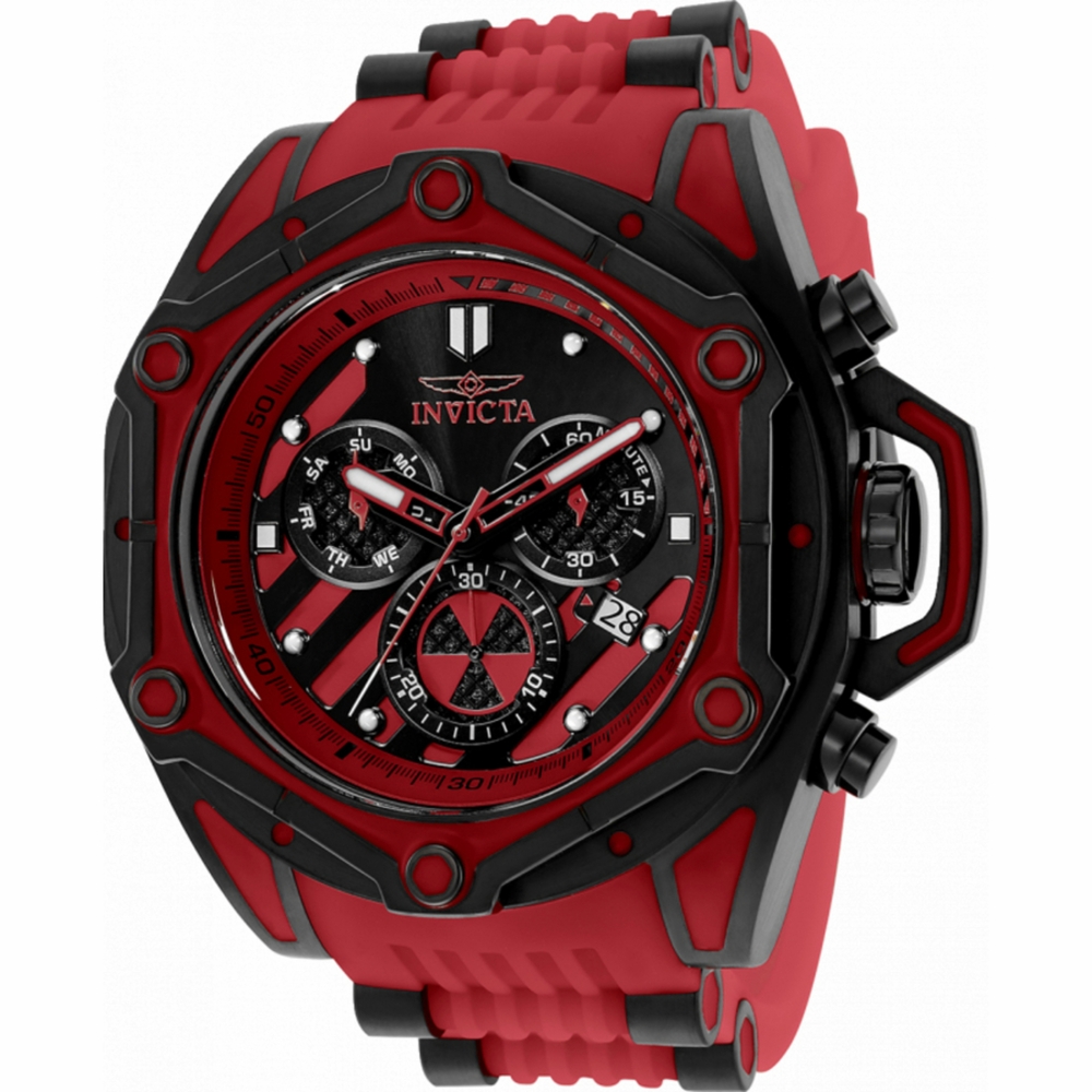 Black stainless steel case with a red and black silicone and stainless steel strap. Fixed red and black stainless steel bezel. Red and white and black dial with red hands and index hour markers. Minute markers around the outer rim. Dial Type: Analog. Luminescent hands and markers. Date display at the 4 o'clock position. Three sub-dials displaying: day, 60 second and 30 minute. Ronda Caliber Z60 FE quartz movement. Scratch resistant Flame Fusion crystal. Pull / push crown. Solid case back. Round case shape, case size: 54 mm, case thickness: 17.2 mm. Band width: 26 mm, band length: 8.25 inches. Buckle clasp. Water resistant at 100 meters / 330 feet. Functions: chronograph, date, day, hour, minute, second. Sea Monster Series. Casual watch style. Watch label: Swiss Movt. Invicta Sea Monster Chronograph Quartz Mens Watch 34786.