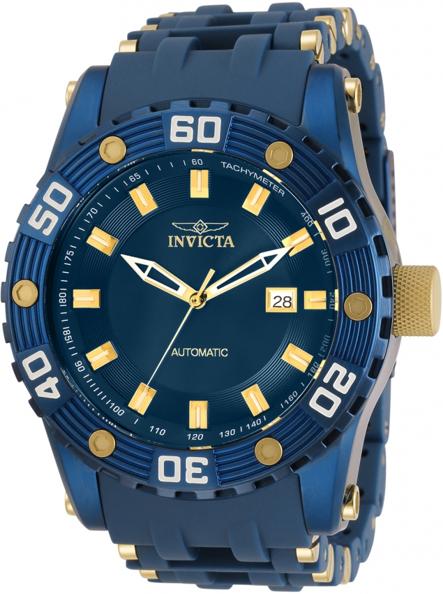 Blue-plated stainless steel case with a blue-plated stainless steel bracelet with yellow gold-tone barrel inserts. Uni-directional rotating blue-plated bezel. Blue dial with gold-tone skeleton sword-shaped hands and index hour markers. Tachymeter markers around the outer rim. Dial Type: Analog. Luminescent hands and markers. Date display at the 3 o'clock position. TMI caliber NH35 Automatic movement, containing 24 jewels, bitting at 21600 vph, and has a power reserve of approximately 41 hours. Scratch resistant flame fusion crystal. Pull / push crown. Transparent case back. Round case shape. Case size: 50 mm. Case thickness: 16 mm. Band width: 26 mm. Band length: 7.25 inches. Fold over clasp. Water resistant at 100 meters / 330 feet. Functions: date, hour, minute, second. Sea Spider Series. Casual watch style. Watch label: Japan Movt. Invicta Sea Spider Automatic Blue Dial Mens Watch 31693.