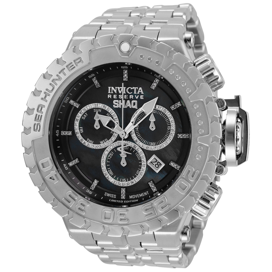 Silver-tone stainless steel case and bracelet. Uni-directional rotating silver-tone stainless steel bezel. Black dial with silver-tone hands and index hour markers. Minute markers around the outer rim. Dial Type: Analog. Luminescent hands. Date display between 4 and 5 o'clock position. Three sub-dials displaying: day, 60 second and 30 minute. Ronda Caliber Z60 quartz movement. Scratch resistant Flame Fusion crystal. Screw down crown. Solid case back. Round case shape, case size: 57 mm, case thickness: 19.15 mm. Band width: 31.3 mm, band length: 8.25 inches. Fold over clasp. Water resistant at 500 meters / 1650 feet. Functions: chronograph, date, day, hour, minute, small second. Shaq Series. Dive watch style. Watch label: Swiss Movt. Invicta SHAQ Chronograph Quartz Black Dial Mens Watch 34612.
