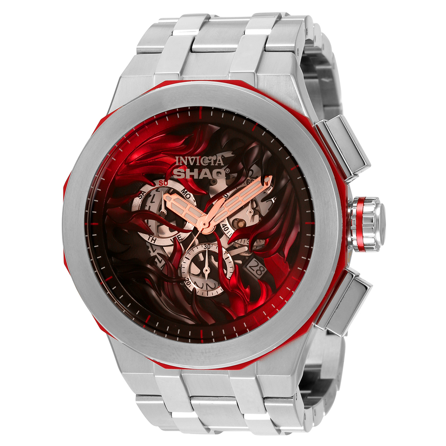 Stainless steel case with a stainless steel bracelet. Fixed stainless steel bezel with a red rim. Red (skeleton) dial with luminous rose gold-tone hands and index hour markers. Minute markers around the outer rim. Dial Type: Analog. Luminescent hands. Date display between the 4 and 5 o'clock positions. Chronograph - two sub-dials displaying: 60 second and 30 minute. Day of the week sub-dial. Ronda caliber Z60 quartz movement. Scratch resistant Flame Fusion crystal. Pull / push crown. Solid case back. Dodecagon case shape, case size: 52 mm. Case thickness: 17.1 mm. Band width: 30 mm, band length: 8 inches. Hidden clasp. Water resistant at 100 meters / 330 feet. Functions: chronograph, date, day, hour, minute, small second. Shaq Series. Casual watch style. Watch label: Swiss Movt. Invicta SHAQ Chronograph Quartz Red Dial Mens Watch 34816.