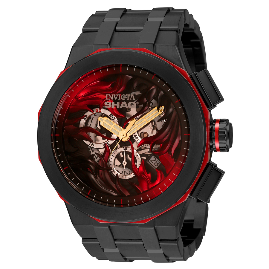 Black-plated stainless steel case and bracelet. Fixed black-plated bezel. Red (skeleton) dial with luminous gold-tone hands and index hour markers. Minute markers around the outer rim. Dial Type: Analog. Luminescent hands. Date display between the 4 and 5 o'clock positions. Chronograph - two sub-dials displaying: 60 second and 30 minute. Day of the week sub-dial. Ronda caliber Z60 quartz movement. Scratch resistant Flame Fusion crystal. Pull / push crown. Solid case back. Dodecagon case shape. Case size: 52 mm. Case thickness: 17.1 mm. Band width: 30 mm. Band length: 8 inches. Hidden fold over clasp. Water resistant at 100 meters / 330 feet. Functions: chronograph, date, day, hour, minute, small second. Shaq Series. Casual watch style. Watch label: Swiss Movt. Invicta SHAQ Chronograph Quartz Red Dial Mens Watch 34817.