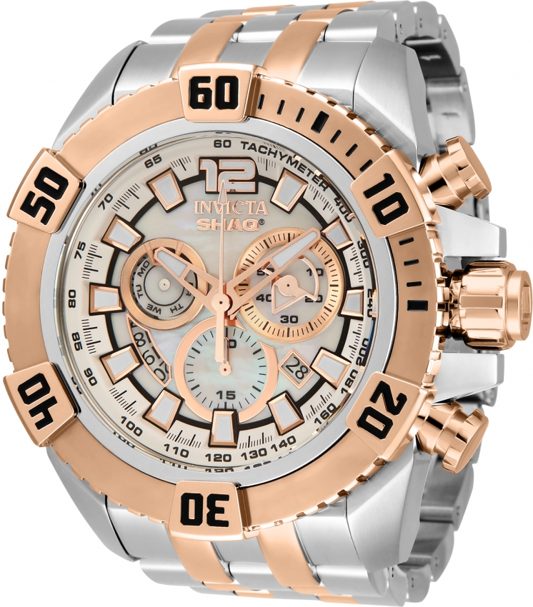 Two-tone (silver-tone and rose gold-tone) stainless steel case with a silver-tone and rose gold stainless steel bracelet. Uni-directional rotating rose gold-tone stainless steel bezel. White dial with rose gold-tone hands and index hour markers. Tachymeter scale around the outer rim. Dial Type: Analog. Luminescent hands and markers. Date display between 4 and 5 o'clock position. Three sub-dials displaying: day, 60 second and 30 minute. Ronda Caliber Z60 quartz movement. Scratch resistant Flame Fusion crystal. Pull / push crown. Solid case back. Round case shape, case size: 56 mm, case thickness: 17.7 mm. Band width: 31 mm, band length: 9.25 inches. Fold over clasp. Water resistant at 200 meters / 660 feet. Functions: chronograph, date, day, hour, minute, small second. Shaq Series. Imparting a formidable aesthetic the Invicta Shaq collection embodies the attributes and energy of the world-renowned Shaquille O'Neal. Having selected key favorites Shaq and Invicta have created a collection representative of his horological vision and vibe. Casual watch style. Watch label: Swiss Movt. Invicta SHAQ Chronograph Quartz White Dial Mens Watch 33769.